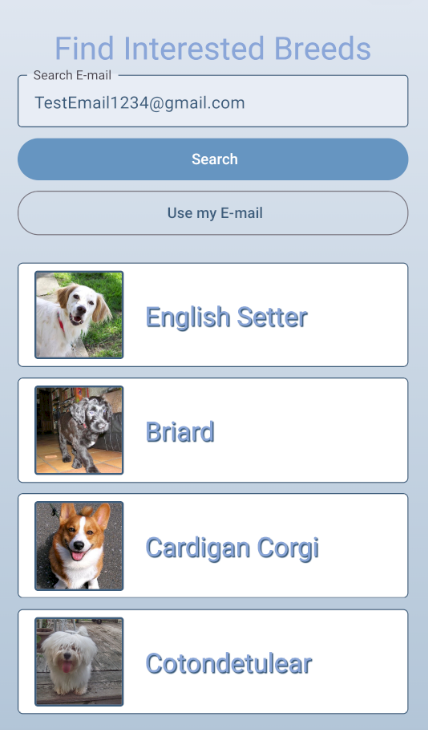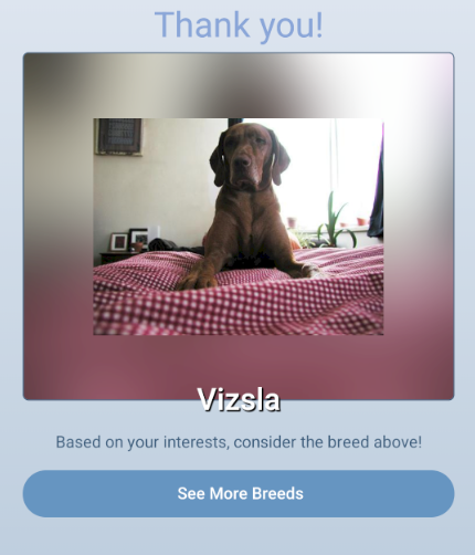 In order to generate the dog breeds, the application fetches 10 breeds using Dog CEO’s DogAPI as a provider. When the user finishes selecting all breeds, they can choose to see more, and are reminded of a breed they liked.